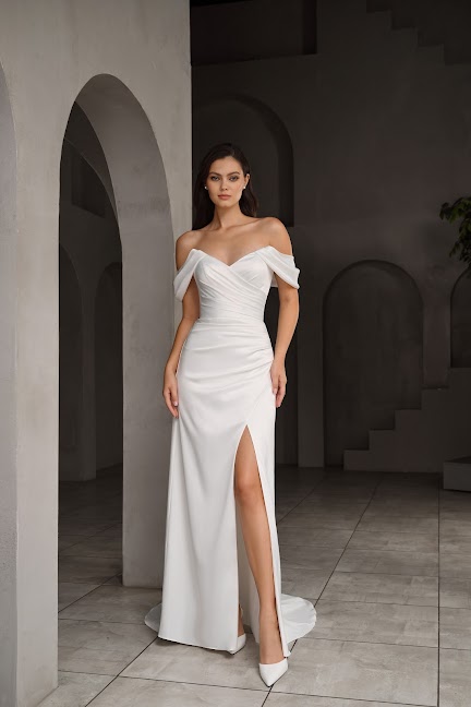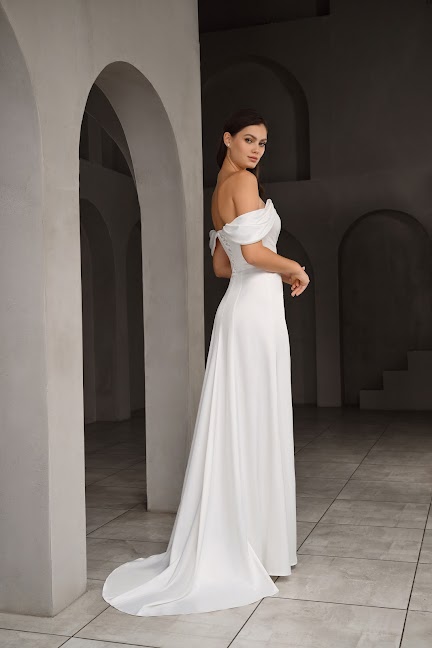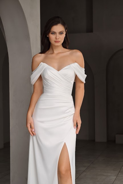 Глубокий соблазнительный разрез по ноге добавляет образу легкости и динамики.Основой платья стал гладкий и благородный атлас. Мягкая сборка от линии груди до уровня бедер, создает идеальный силуэт, мягко облегающий фигуру и скрывающий возможные недостатки. Платье дополнено коротким шлейфом - это дань традициям и удобство для движения.