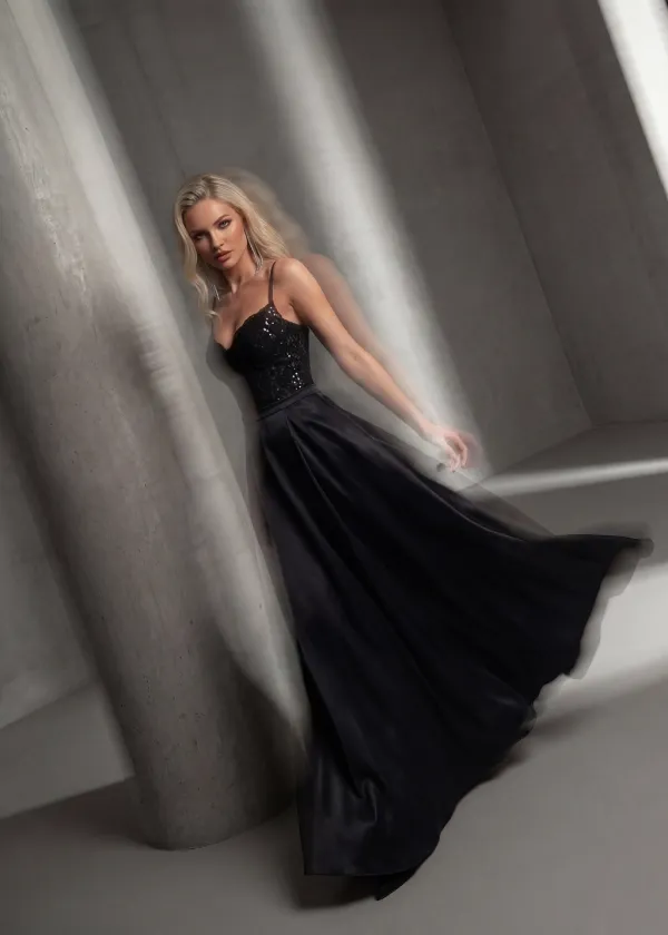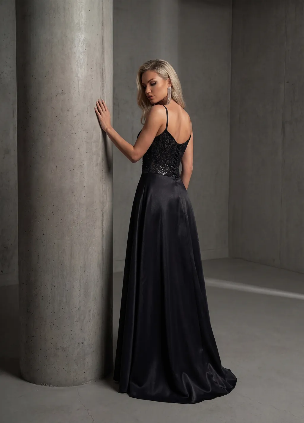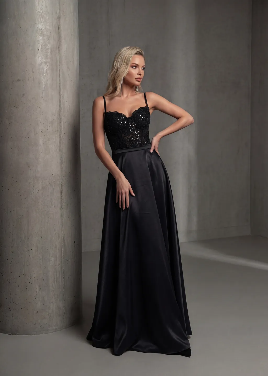 Платье для тех, кто хочет не просто появиться, а произвести впечатление. Главный акцент платья - кружевной верх на бретельках, изысканно расшитый мелкими черными пайетками. Они создают тонкое, мерцающее сияне при каждом движении, добавляя образу таинственности и роскоши. Платье А-силуэта, струящаяся юбка в пол добавляет образу легкости и грации. Это платье станет идеальным выбором для свадьбы, выпускного вечера, романтического ужина или любого торжественного события, где вы хотите выглядеть безупречно.