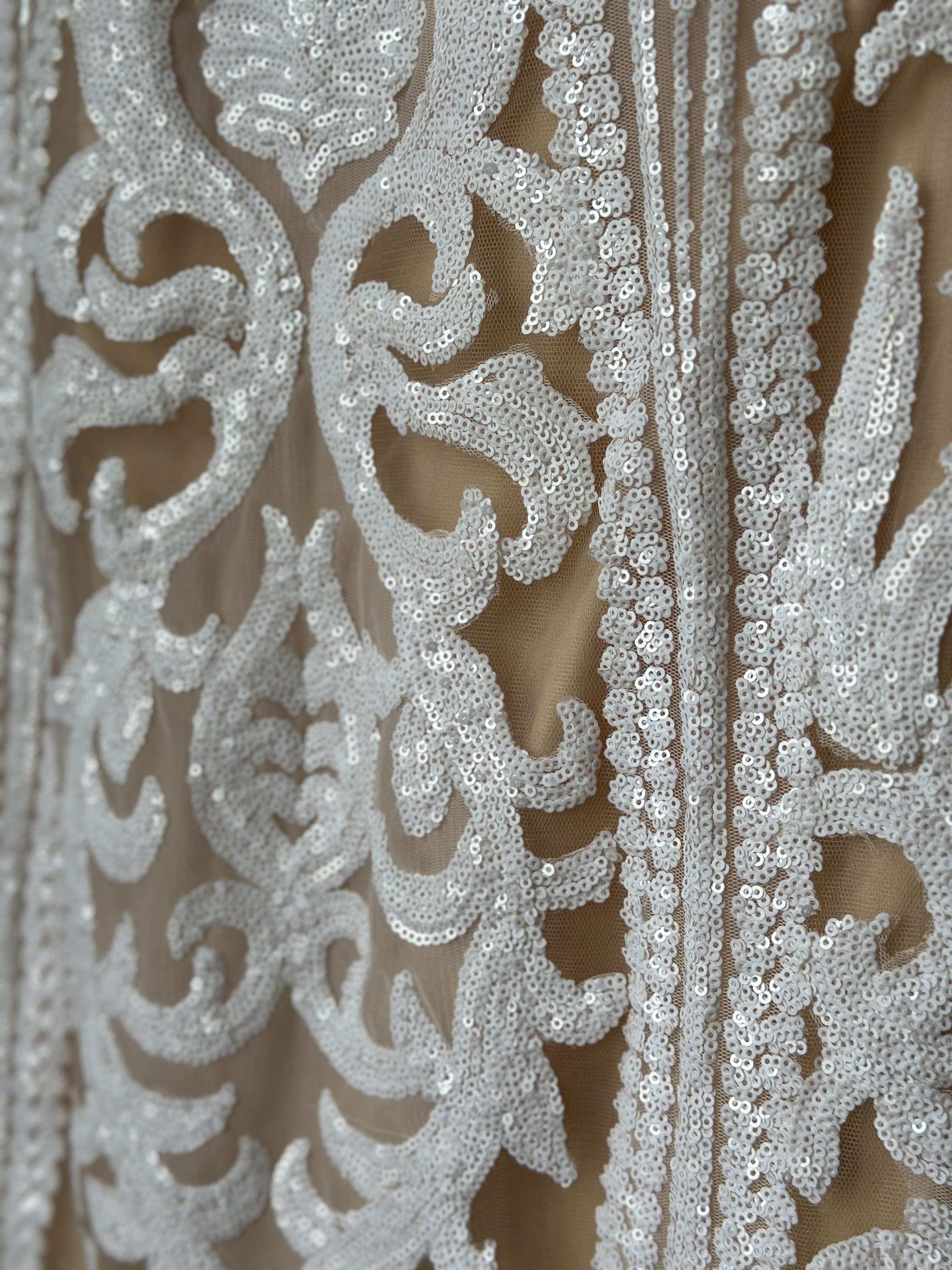 Телесное платье Carmela, расшитое белыми пайетками на тонких бретелях — для невесты, мамы невесты и подружек, желающих подчеркнуть свою естественную красоту и изысканный блеск в Москве!